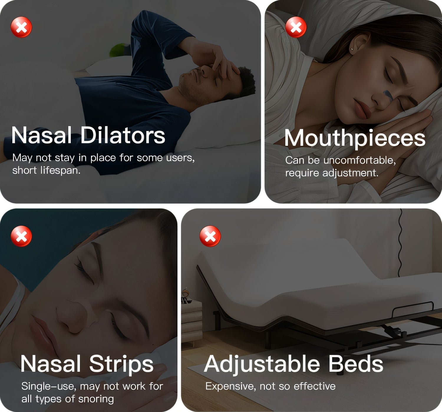Common attempts to eliminate the chance of snoring include anti-snoring month-piece, mouth strips, nasal dilators, and electronic stimulators, which areinvasivetools that contradictsleeping habits. They could create morediscomfortor incur additionaldamage.