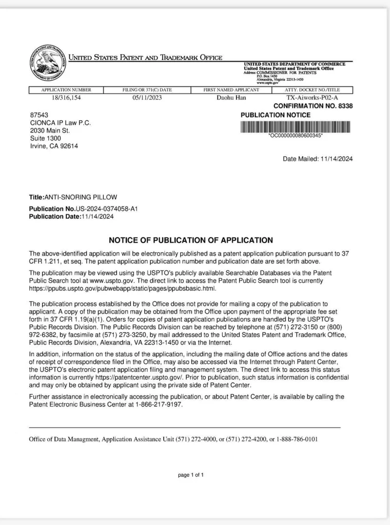 Based onfundamental principles, experimental research, and clinical data, we have developed arange of anti-snoring products, including variouspillow designs. These products have undergonerigorous testingto ensureeffectivenessandsafety. As a result, we have successfully obtainedpatentsfrom the USPTO, securingintellectual property rightsfor our innovative technologies.