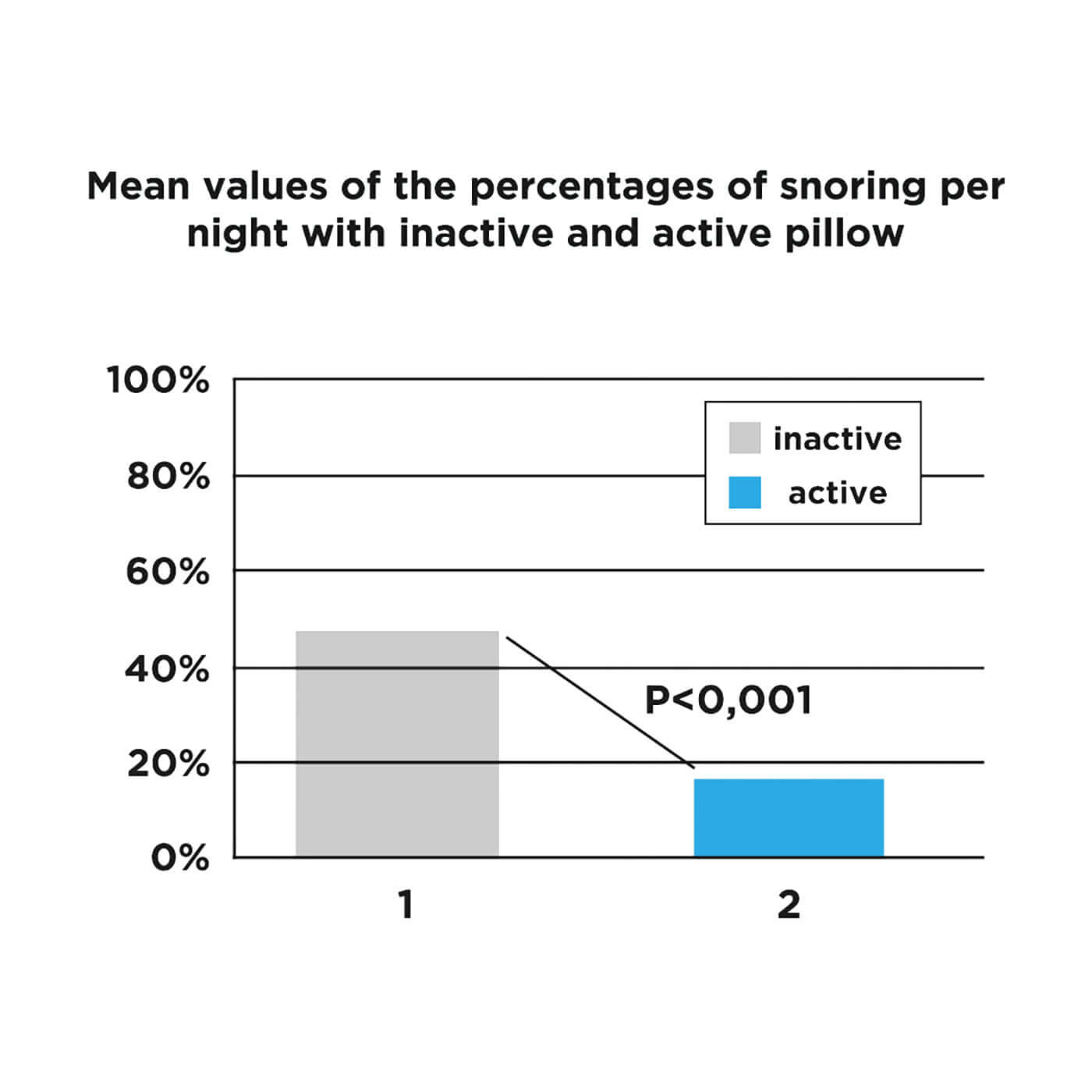Activated anti-snore pillow reduces snoring by 67±13.9% (p<0.01) compared to 48±16.7% when inactive.