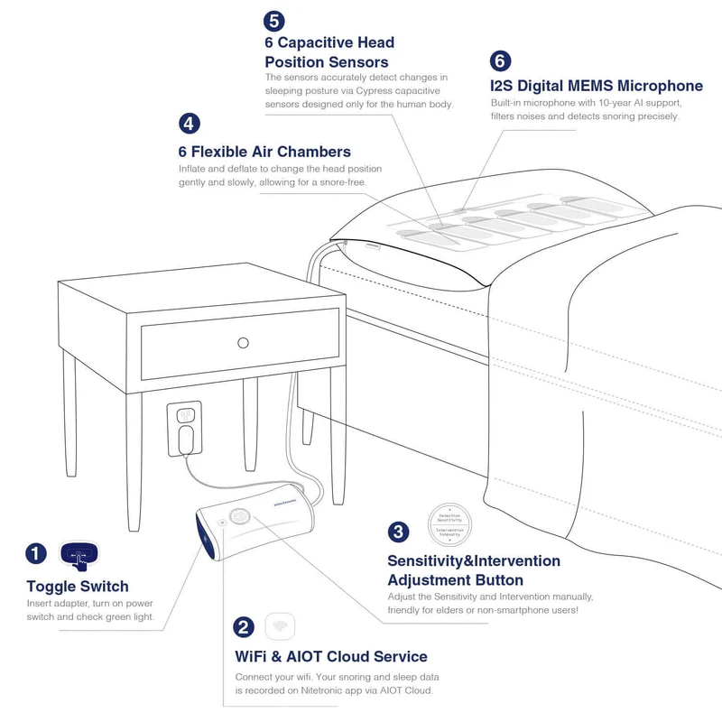 Nitetronic Smart Anti Snore Pillow is equipped with MEMS sensors to monitor snoring and 6 flexible air chambers and 6 inductive position sensors to guide the head into a side-sleeping position. With advanced noise reduction and 10 years of AI algorithm validation, you will enjoy a snore-free and peaceful sleep.